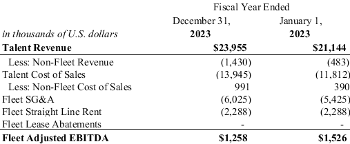 The Company also uses Fleet Adjusted EBITDA to evaluate the performance of its MiniLuxe Core Studio business (19 MiniLuxe-branded studios operating for 1+ year). This metric is calculated in a similar manner, starting with Talent revenue and adjusting for non-fleet Talent revenue and cost of sales, further adjusted by fleet general and administrative expenses and finally subtracting straight line rent expense (similar to amount used in the full company Adjusted EBITDA, less amounts allocated to locations outside of MiniLuxe’s core studio business, i.e. Paintbox). The Company believes that this metric most closely mirrors how management views the fleet portion of the business. A reconciliation of Talent revenue to Fleet Adjusted EBITDA is included in Selected Consolidated Financial Information.