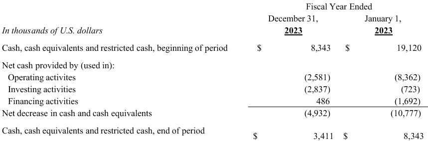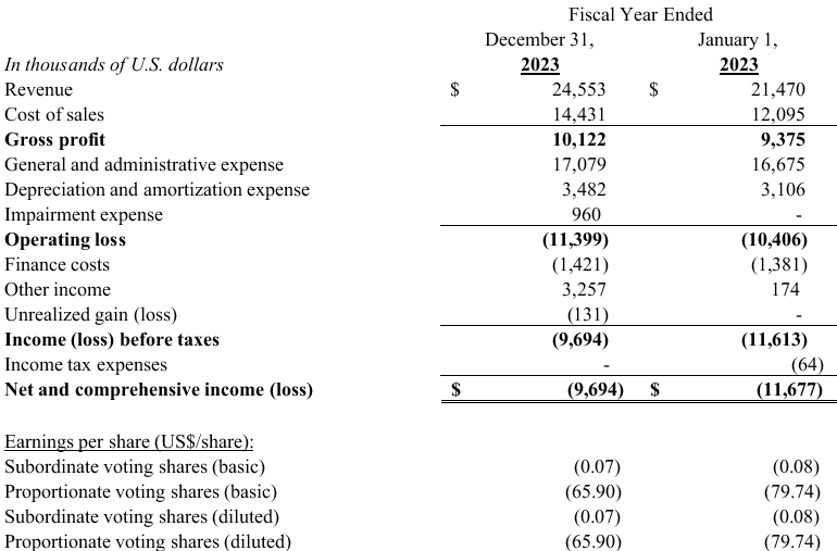 The following table outlines the consolidated statements of loss and comprehensive loss for the fiscal years ended December 31, 2023 and January 1, 2023: